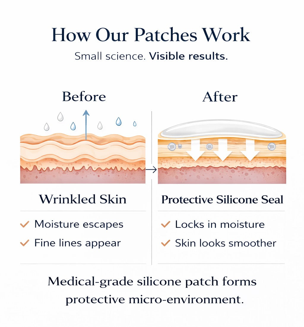 Zuvelle Anti Wrinkle Patches work by creating a microclimate that locks in moisture and oxygen, helping your skin naturally boost collagen production and elasticity. Made from medical grade silicone, the patches gently smooth the surface while hydrating deep layers of skin. This environment supports overnight repair so you wake up to visibly firmer, rejuvenated, and more radiant skin