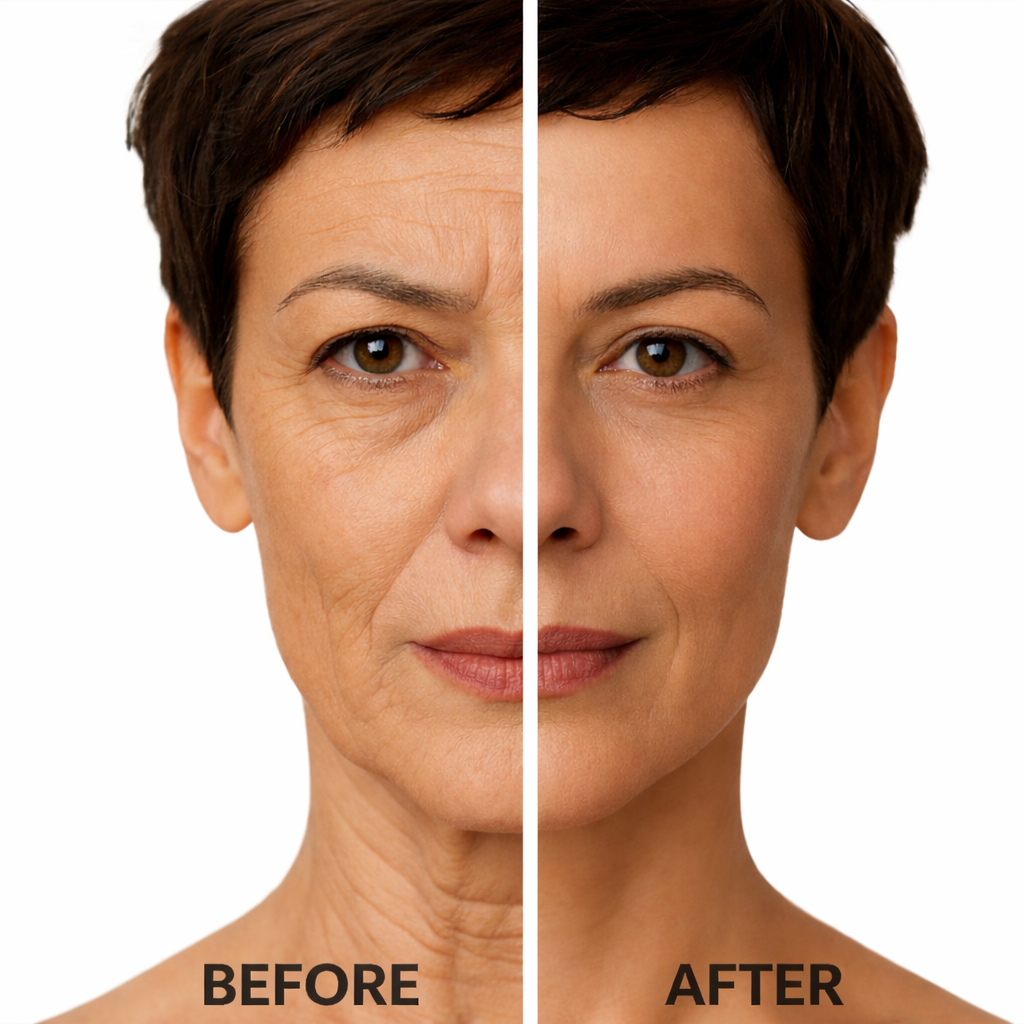 This side by side shows the subtle yet striking difference consistent care can bring. Softer features, a brighter eye area, and a noticeably smoother texture reveal a more rested, refined version of your natural beauty.
