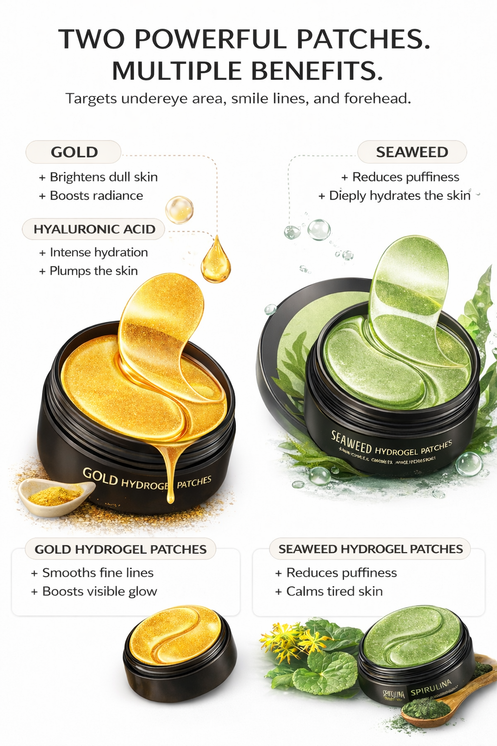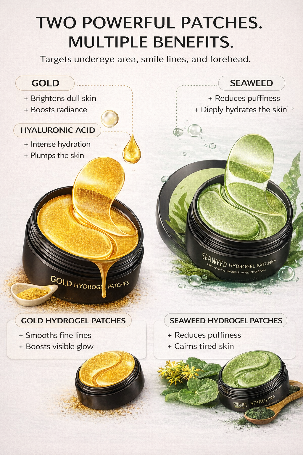 Infused with skin-loving ingredients like 24K Gold, Seaweed Extract, Hyaluronic Acid, and Collagen, these patches work to nourish, smooth, and support a brighter, more rested appearance over time.